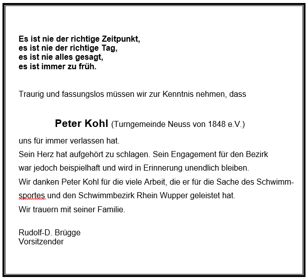 - Die Vereine Düsseldorfer SC IV und der Velberter SC haben ihre Teilnahme an diesem Turnier abgesagt. Als Nachrückende Vereine kämen die SGW FS/Neuenhof und die SGW Remscheid / LTV in Betracht. Mit der Bitte an diese Vereine, Zeitnah eine Zustimmung oder Absage mitzuteilen. Über eine Teilnahme würde der Wasserballausschuss sich sehr freuen und wäre wünschenswert.